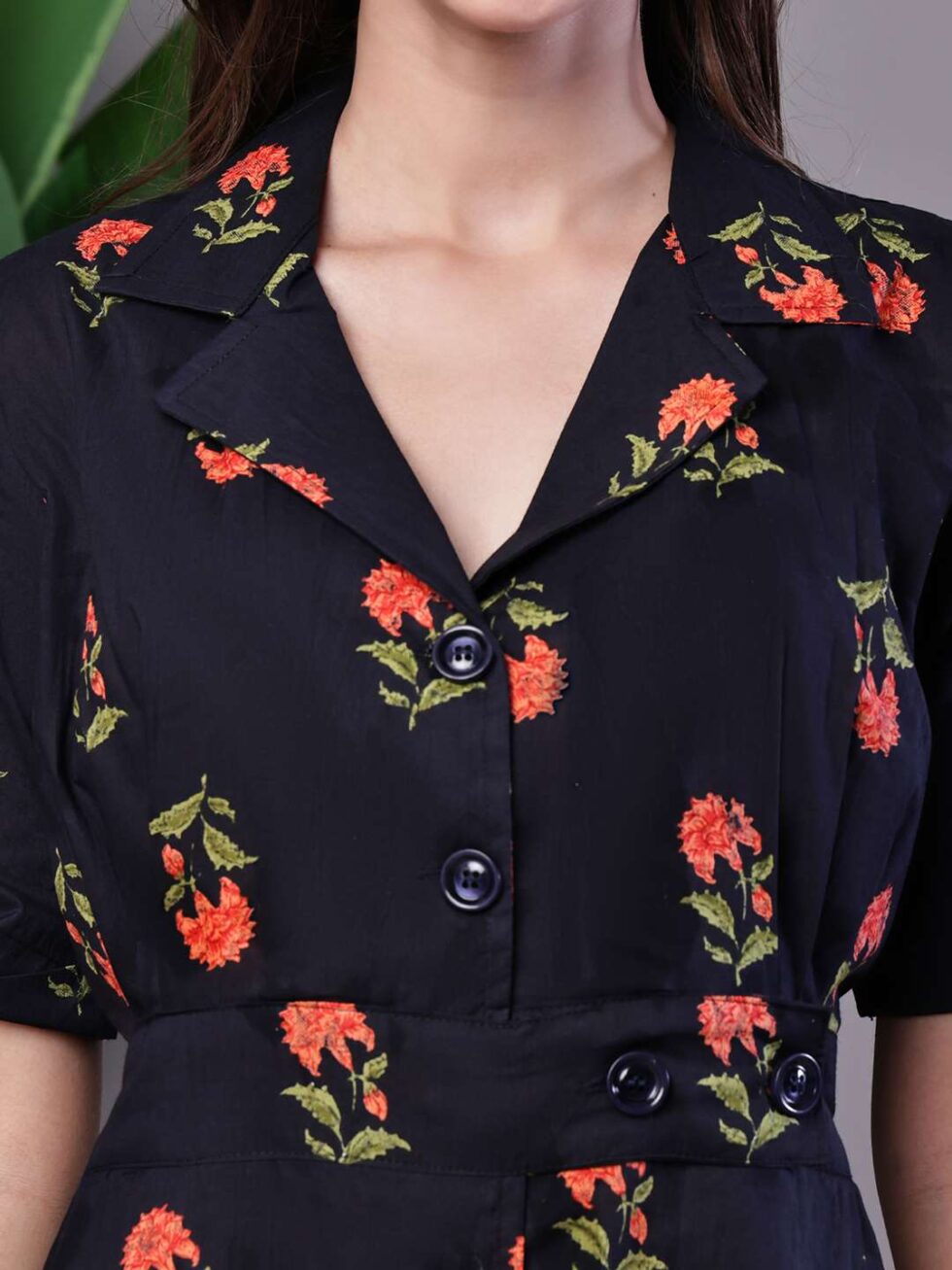 Women’s Elegant Indigo & Orange Floral Block Print Cotton Shirt Dress